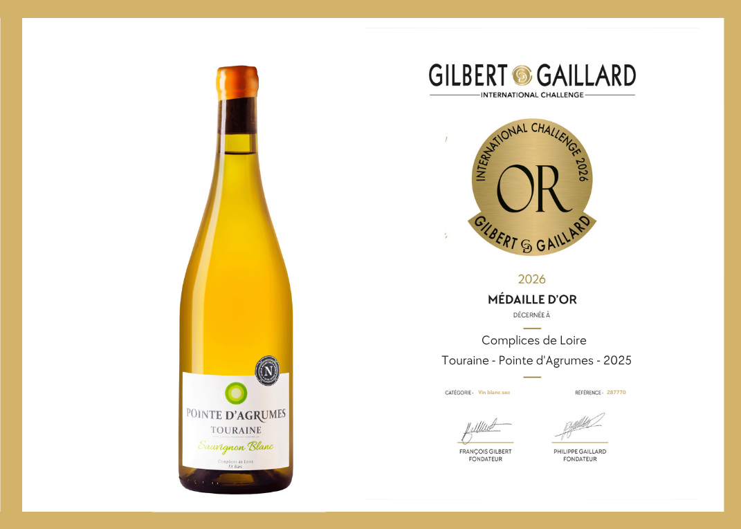 Another fine accolade for Complices de Loire: our Touraine Sauvignon “Pointe d’Agrumes” has been awarded the Gilbert & Gaillard Gold Medal. This Sauvignon seduces with its bright,